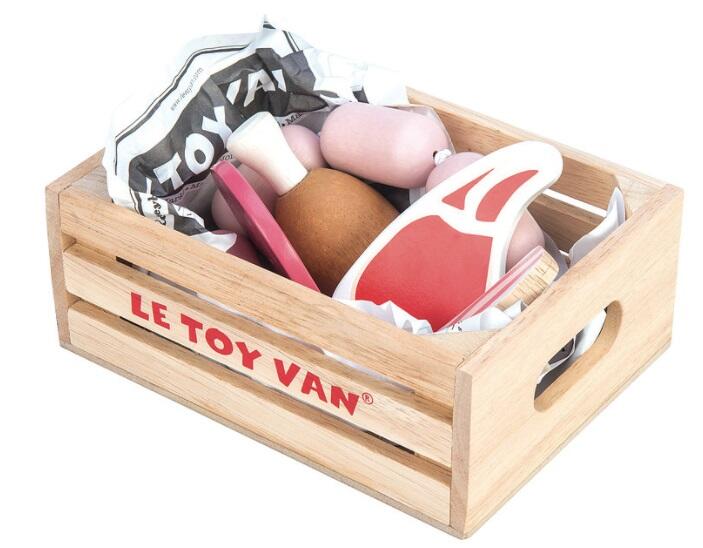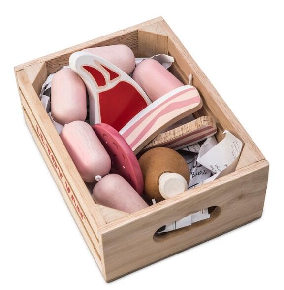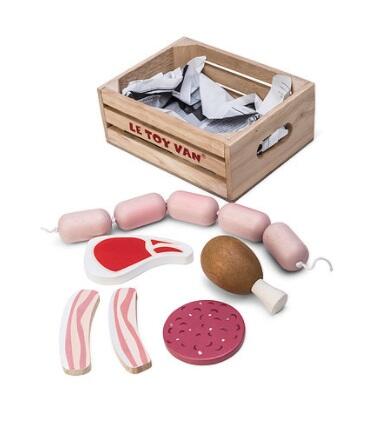 A complete wooden box with: sausage pieces, steak, chicken, salami and bacon. Recommended age: From 3 years Dimensions: 16 x 12 x 6 cm (ler mais)