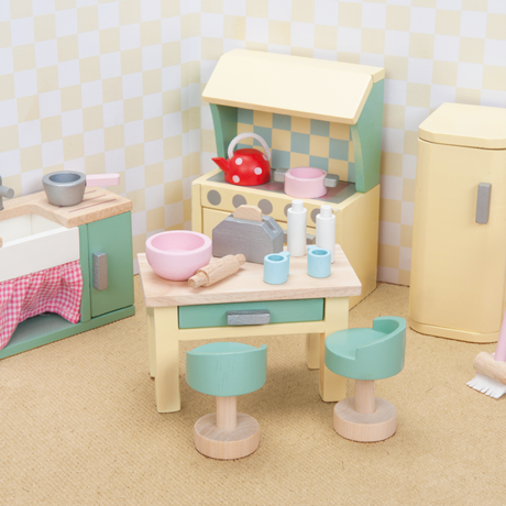 Set 20 parts painted wood. It includes a dishwasher Sink, fridge, stove, table, chairs, kitchen utensils crockery. Dolls sold separately. Recommended age: From 3... (ler mais)