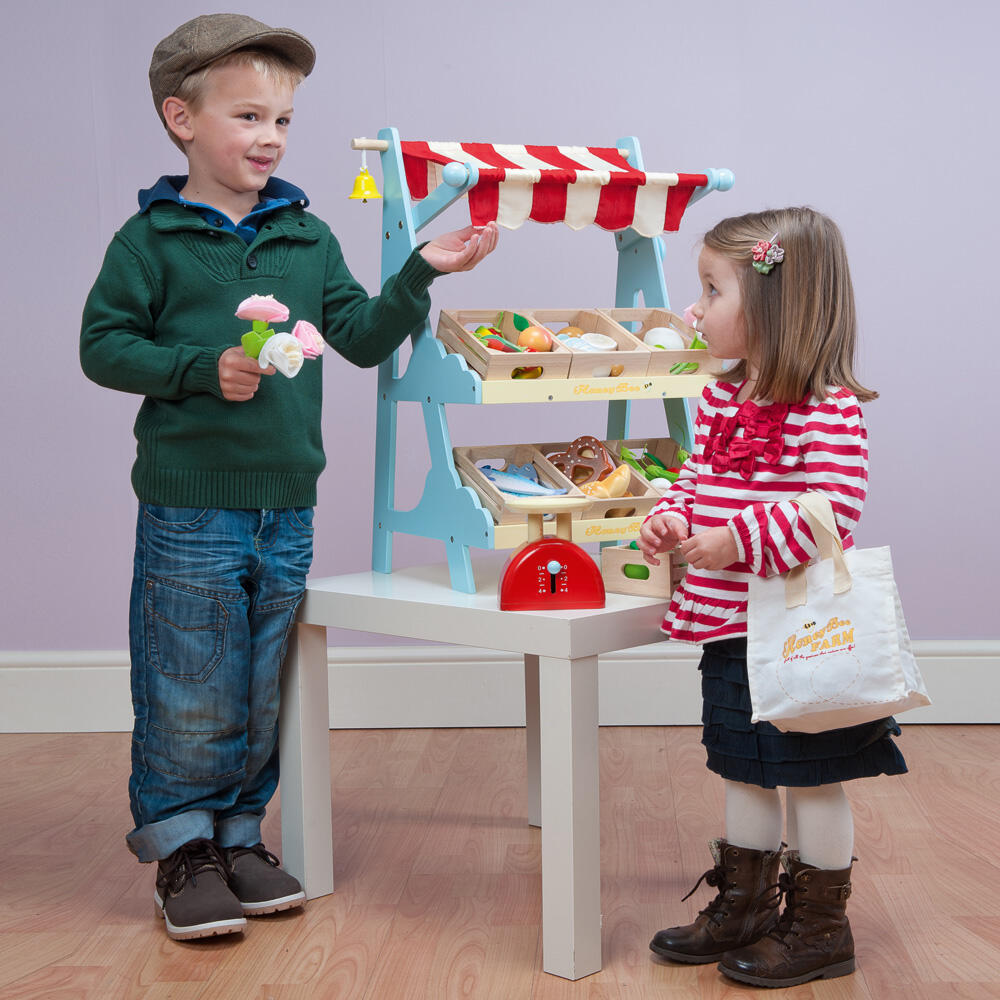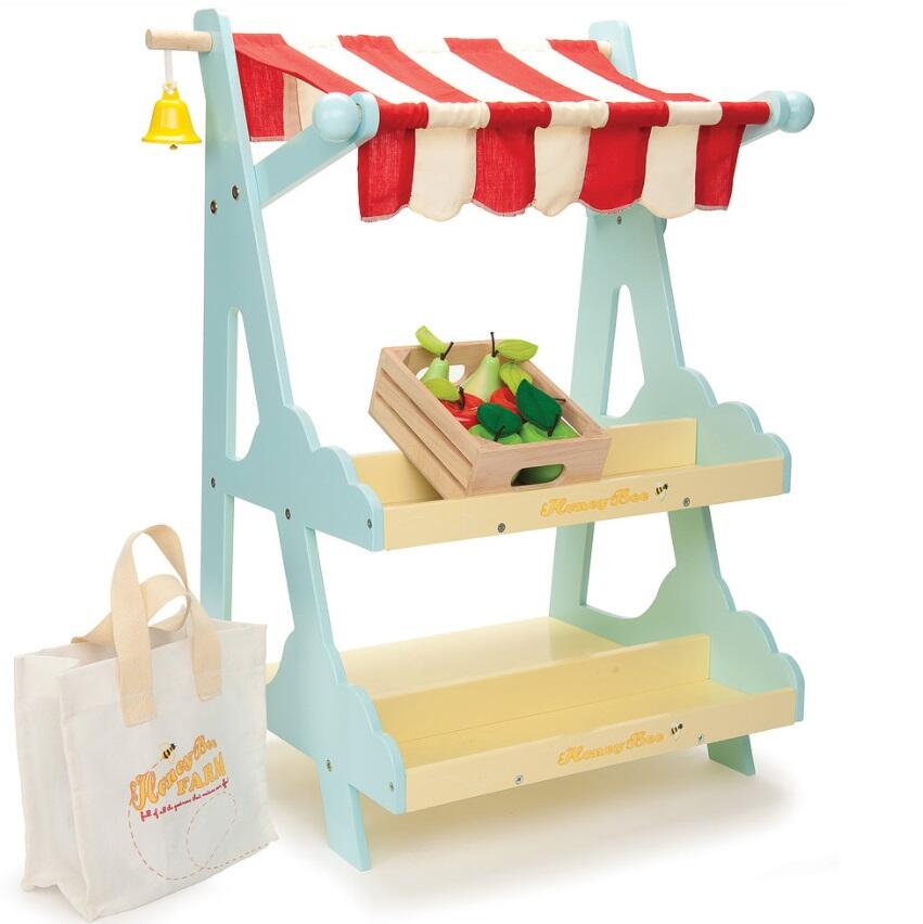 Esta carpa mercado deliciosa tiene un toldo y una campana construida. Incluir una bolsa de lona de compras y una caja de manzanas y peras.