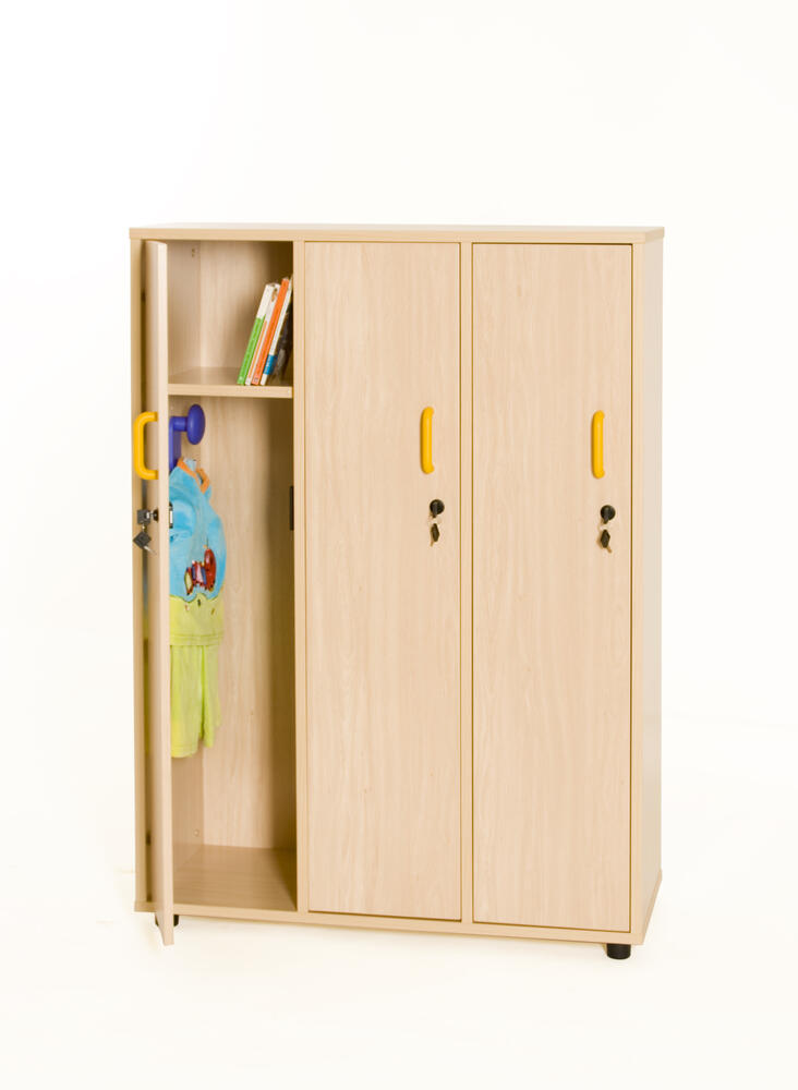 Conjunto 3 taquillas individuales con el estante para cada casillero, hecha de melamina de haya de 19 mm de espesor, de nuevo 10 mm, esquinas de PVC de 2 mm y nivelación piernas PVC de 4 cm de diámetro, con una selección de alturas (4 y 8 cm) para evitar que la humedad y los posibles huecos que puedan existir en el suelo. Las puertas contienen un sistema anti pellizco de los dedos y las juntas para poner fotografías de identificación de los niños.
