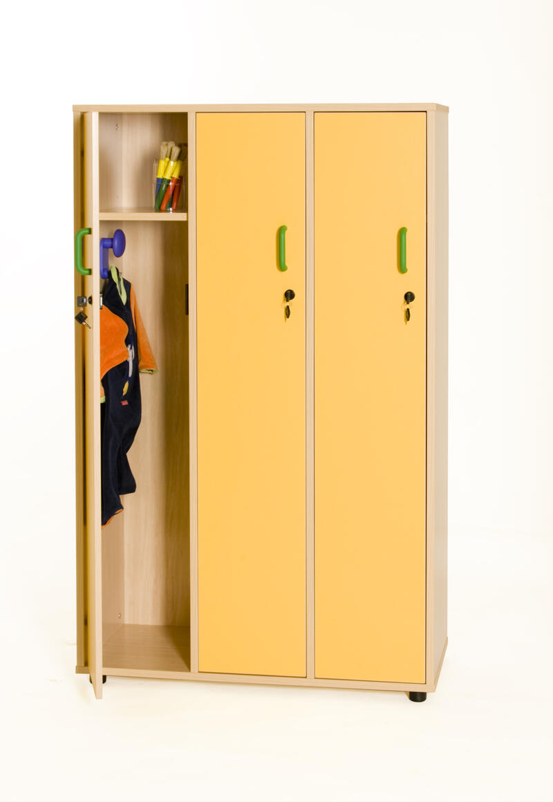 Conjunto 3 taquillas individuales con el estante para cada casillero, hecha de melamina de haya de 19 mm de espesor, de nuevo 10 mm, esquinas de PVC de 2 mm y nivelación piernas PVC de 4 cm de diámetro, con una selección de alturas (4 y 8 cm) para evitar que la humedad y los posibles huecos que puedan existir en el suelo. Las puertas contienen un sistema anti pellizco de los dedos y las juntas para poner fotografías de identificación de los niños.