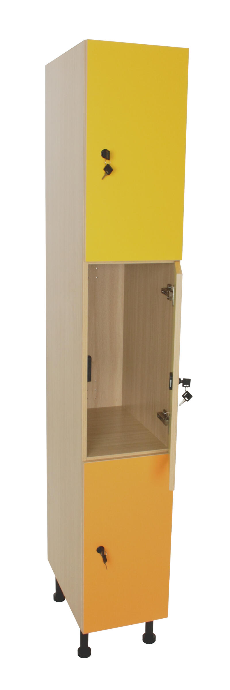 Conjunto taquillas individuales en la columna con tres puertas y estante para cada armario, hechas de melamina de haya de 19 mm de espesor, de nuevo 10 mm, 2 mm esquinas de PVC y patas niveladoras de PVC de 4 cm de diámetro, con la opción de veces (4 y 8 cm) para evitar que la humedad y los posibles huecos que puedan existir en el suelo. Las puertas contienen un sistema anti pellizco de los dedos y las juntas para poner fotografías de identificación de los niños.