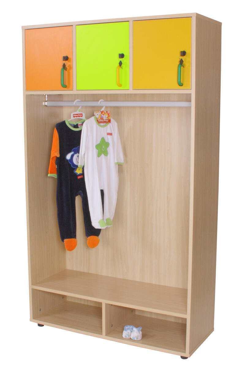 Locker con 3 puertos en la parte superior, con un espacio abierto por debajo y barra para colgar la ropa en perchas tiene también la parte inferior dos estantes para arrunos, hechas de melamina de haya de 19 mm de espesor, de nuevo a 10 mm, esquina en 2 mm PVC y PVC patas niveladoras 4 cm de diámetro, con la opción de alturas (4 y 8 cm) para evitar que la humedad y los posibles huecos que puedan existir en el suelo. Las puertas contienen un sistema anti pellizco de los dedos y las juntas para poner fotografías de identificación de los niños.