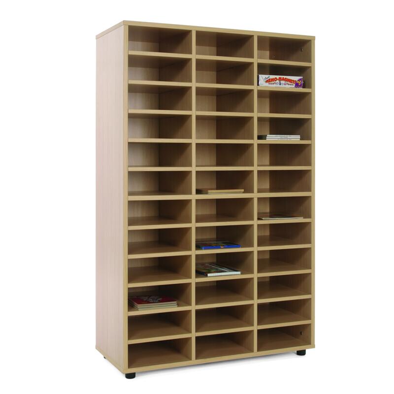 Mobile abrió con 36 estantes. Hecho en melamina de haya con una placa de 19 mm de espesor y 10 mm de espesor en la parte posterior. 2 mm esquinas de PVC. Nivelación de PVC con 4 cm de diámetro, con la opción de dos alturas (4 y 8 cm) para evitar que la humedad y los posibles huecos que puedan existir. Los pies pueden ser retirados para superponer varios armarios. mobiliario plegable con esquinas redondeadas para evitar cortes o heridas. Sistema de montaje por mangas que garantiza la máxima firmeza con fuerte unidad e indestructible. varias pruebas controladas en centros tecnológicos de certificación muebles.