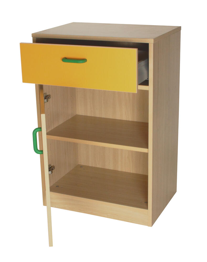 Móvil con un cajón y una puerta. Hecho en melamina de haya con una placa de 19 mm de espesor, 10 mm de espesor y la puerta trasera 16 mm. 2 mm esquinas de PVC. Nivelación de PVC con 4 cm de diámetro, con la opción de dos alturas (4 y 8 cm) para evitar que la humedad y los posibles huecos que puedan existir. Los pies pueden ser retirados para superponer varios armarios. mobiliario plegable con esquinas redondeadas para evitar cortes o heridas. Sistema de montaje por mangas que garantiza la máxima firmeza con fuerte unidad y