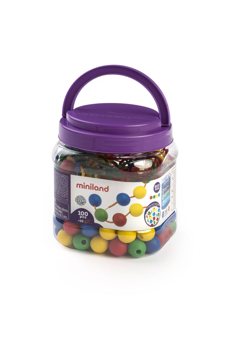 Conjunto de 100 bolas y 10 cuerdas de un metro, para ejercer la coordinación visual y motora.