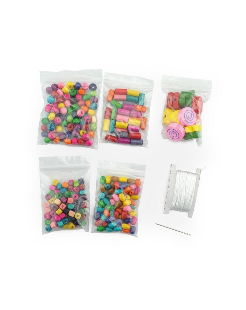 Crie 8 pulseiras de madeira. Conteúdo: contas de madeira, cordão e agulha.