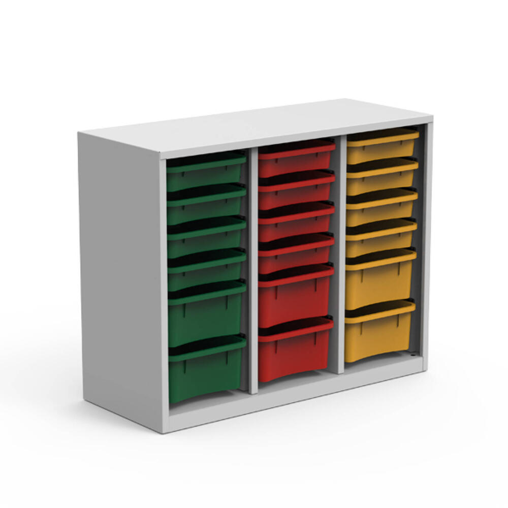 Estrutura em melamina com orlas em PVC. 18 Tabuleiros em polipropileno (12 pequenos + 6 médios). (ler mais)