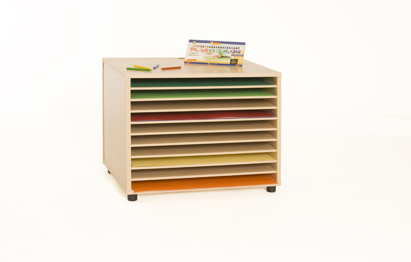 Arquivador de cartolinas com 10 estantes horizontais. Fabricado em melamina de faia, com tabuleiros de 19 mm de espessura, expecto separações verticais de 10 mm com cantos de PVC de 2mm.... (ler mais)
