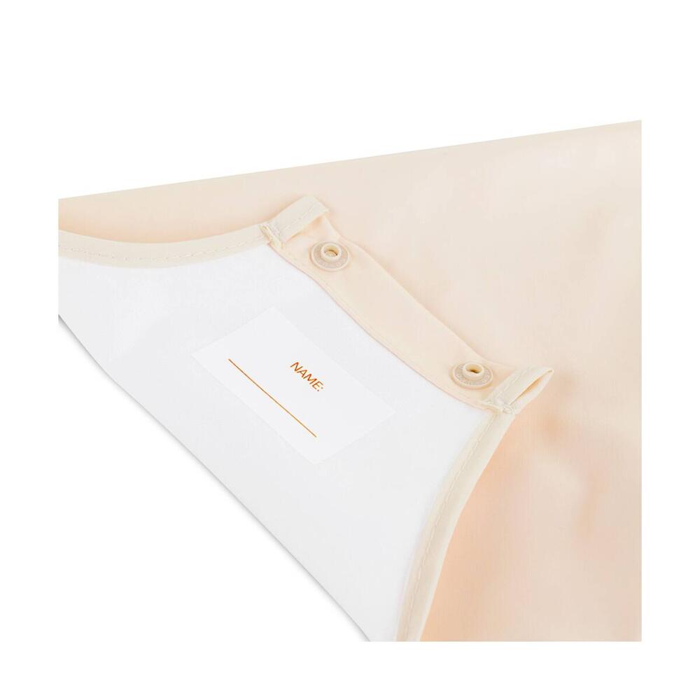 O elástico nos punhos impede que a roupa fique exposta, enquanto o fecho com dois botões de pressão no pescoço garante um ajuste perfeito, adaptando-se a diferentes tamanhos. O bolso grande para migalhas ajuda a manter a área limpa, recolhendo restos de comida ou líquidos, sendo ideais para usar em casa, na creche ou mesmo em passeios. Além disso, possuem uma etiqueta personalizável para escrever o nome dos mais pequenos, algo prático e útil para evitar perdas ou confusões.