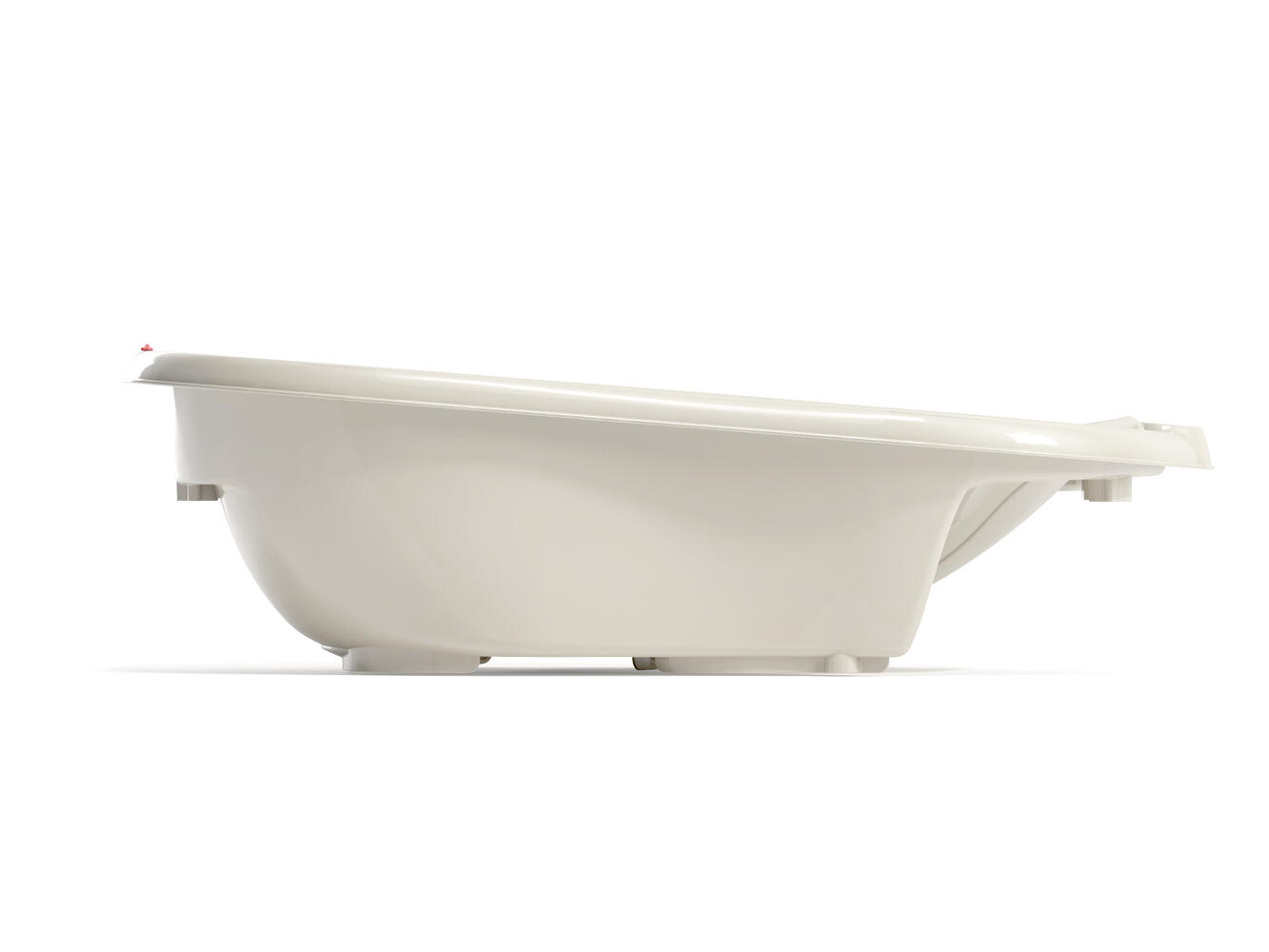 Banheira com três pontos de apoio: dois axilares e um inguinal, posição dupla: 0 - 6 meses e 6 - 12 meses e com tampa para esvaziamento mais rápido da água. Inclui um termómetro embutido e indicador de nível de água recomendado.
