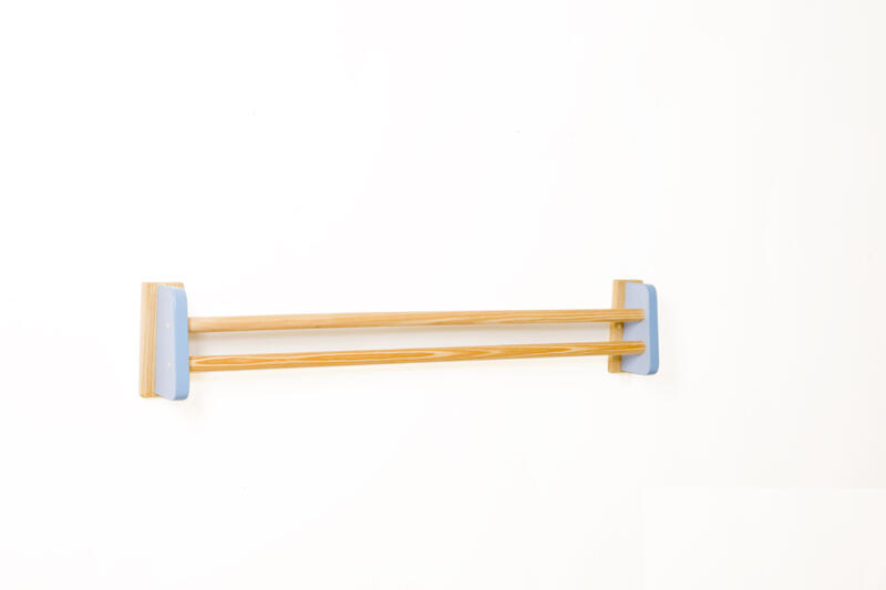 Barra de apoio de pinho maciço de 35 mm de diâmetro, envernizadas com verniz atóxico. Sistema robusto de fixação à parede.