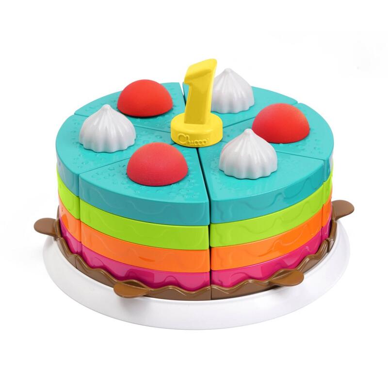 Um bolo colorido pronto a ser decorado, inspirado no método Montessori, com muitas fatias para empilhar! Muitas peças incluídas para estimular a criatividade.