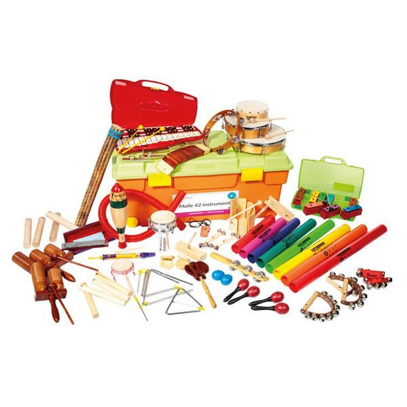 Fabulosa caixa gigante composta por 42 instrumentos de percussão e sopro para as crianças se poderem divertir e tocar a sua música favorita. A seleção destes 42 instrumentos foi projetada para jogos auditivos, iniciação rítmica e abordagem à constituição dos objetos.