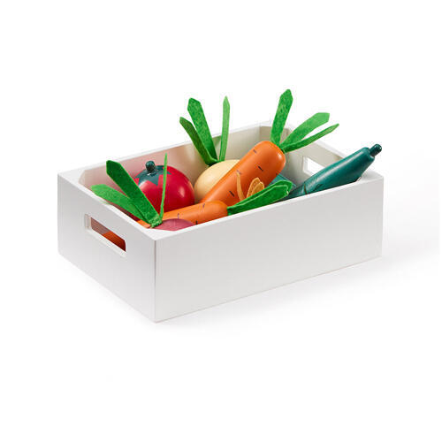 Uma caixa mista de madeira com vegetais. Cenoura, tomate, nabo, cebola, beterraba, limão e pepino. O pepino e o limão podem ser divididos em duas partes e reunidos novamente com velcro.... (ler mais)
