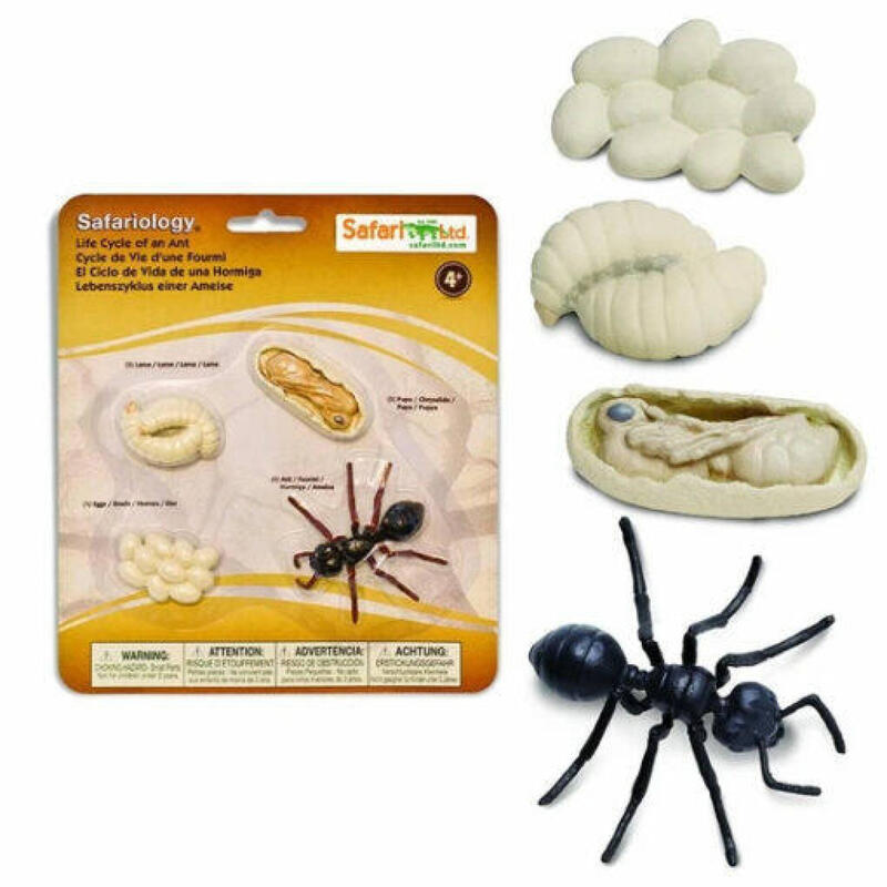 Este conjunto inclui pequenos ovos brancos onde as formigas eclodem. As larvas vêm em seguida, mudando várias vezes antes de entrar em um período de descanso e crescimento como pupas. A formiga adulta que emerge tem uma cor mais escura, mas não cresce devido ao seu exoesqueleto.