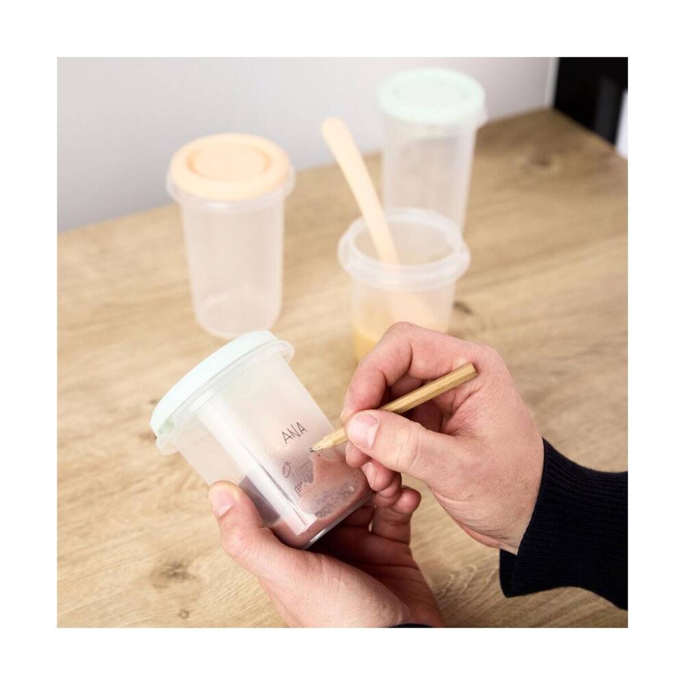 O conjunto de 6 recipientes herméticos é fabricado em Espanha com materiais seguros para a alimentação do bebé. São 100% livres de BPA e permitem escrever com lápis, facilitando a marcação de datas ou do tipo de alimento armazenado para uma melhor organização.