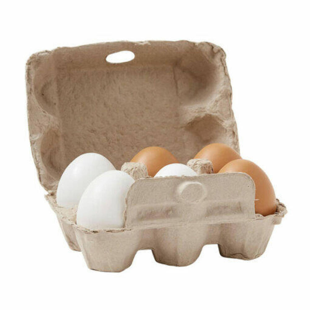 6 ovos de madeira colocados em uma caixa de ovos de verdade. Idade: a partir dos 3 anos. (ler mais)