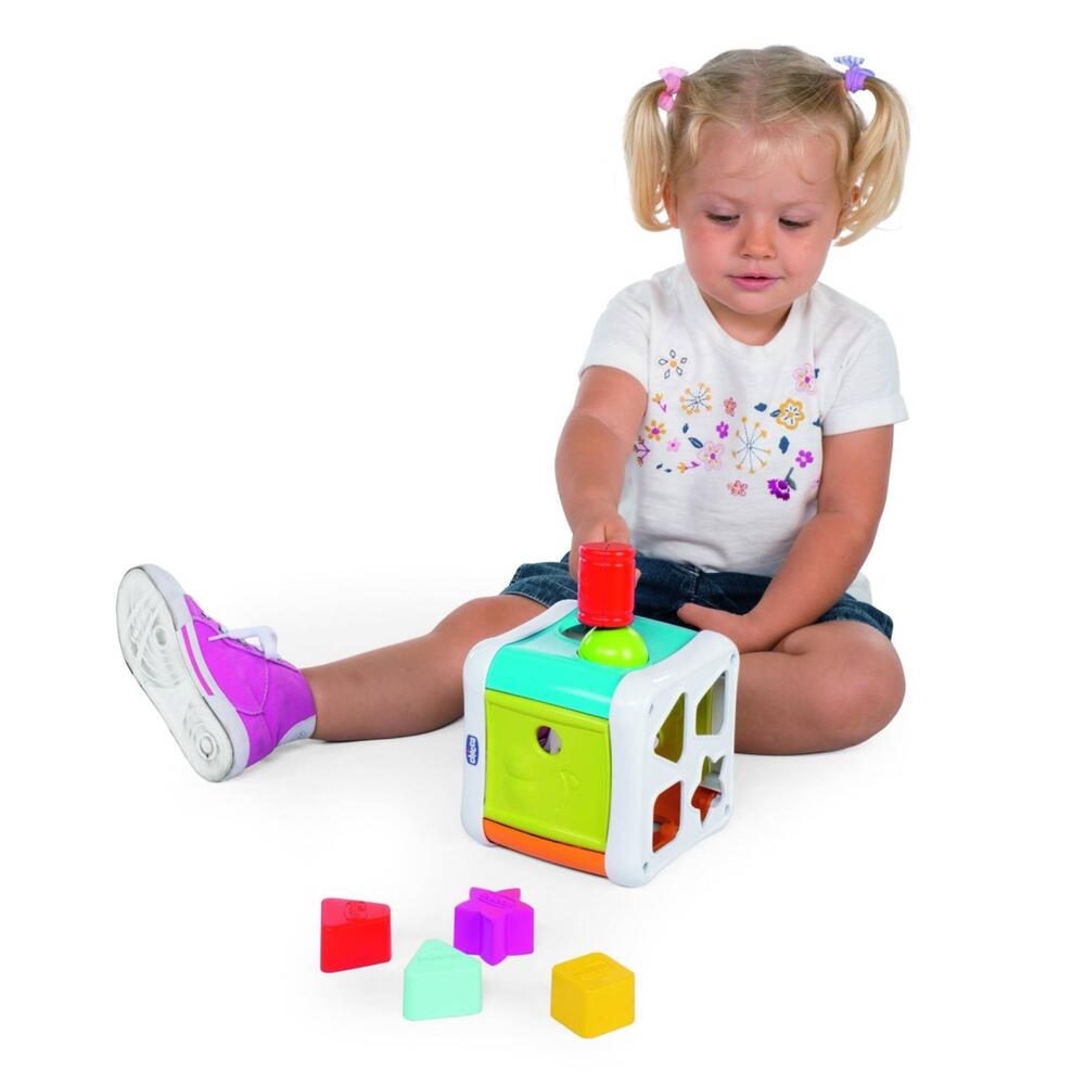 2 em 1! Ordenar: a criança diverte-se ao inserir as 4 formas geométricas coloridas nos espaços corretos em ambos os lados do cubo.