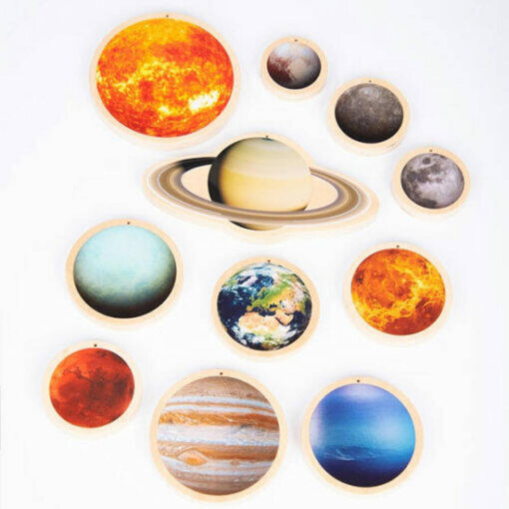 Discos de madeira compensada, macios e agradáveis ??ao toque, impressos em cores em um dos lados com belas e nítidas ilustrações fotorrealistas de nosso sol, Mercúrio, Vênus, Terra, nossa lua, Marte, Júpiter, Saturno, Urano, Netuno e Plutão. O verso está claramente impresso com o nome, diâmetro, temperatura média e distância do sol. As crianças podem facilmente agarrar, girar e virar os discos grossos e mantê-los em pé. Há também um orifício para pendurar os discos como um móbile do sistema solar.