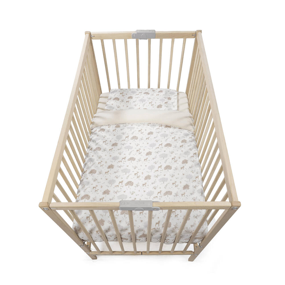 O conjunto inclui: capa de edredão e edredão (enchimento), ambos fabricados em 100% algodão de alta qualidade, garantindo uma suavidade inigualável e uma óptima respirabilidade. O edredão proporciona o calor necessário para um sono confortável, enquanto a capa de edredão, com o encantador estampado da Coleção Nara (veados e árvores em tons neutros), dá um toque de doçura e elegância ao berço. Lençol em musselina 100% algodão, um elemento essencial para o descanso do bebé.