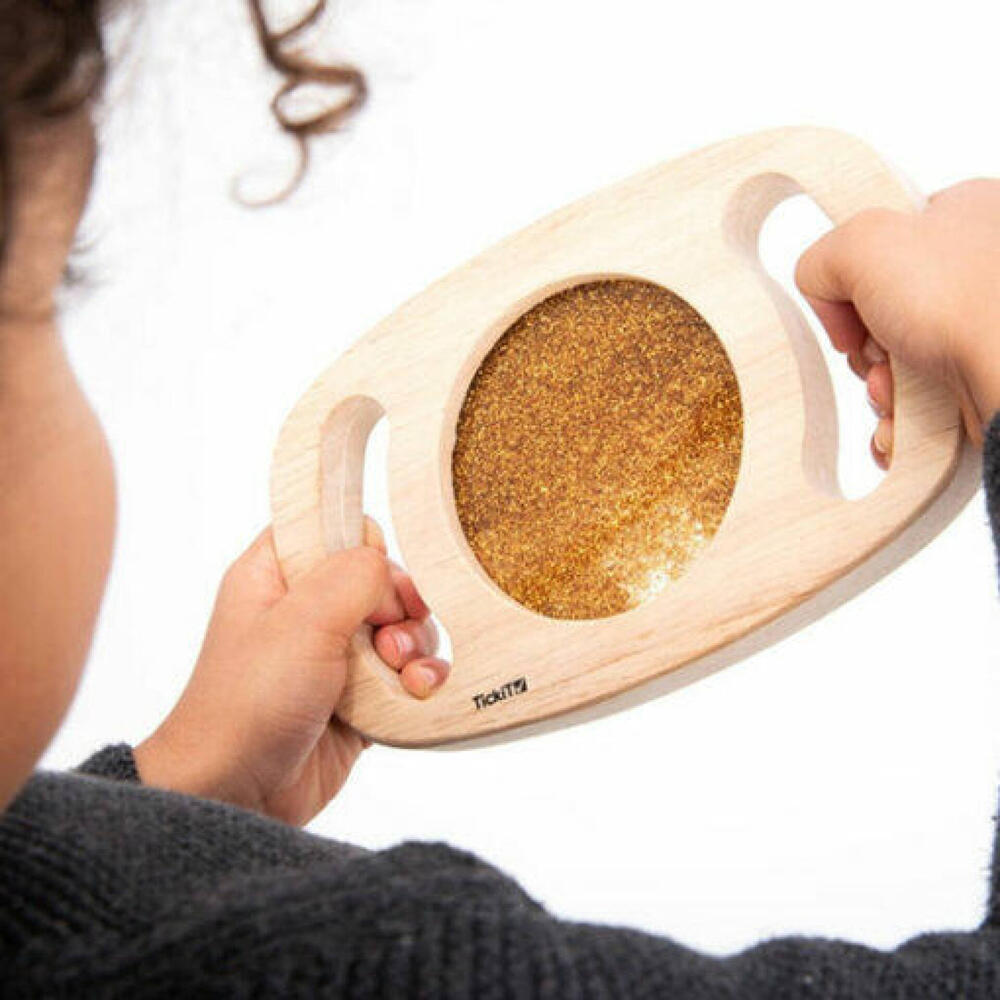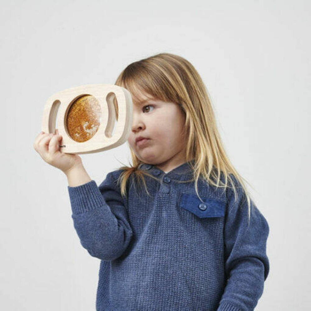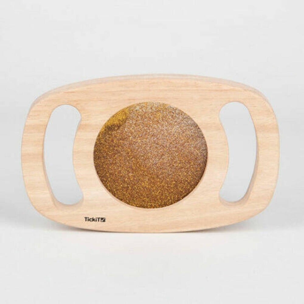 Uma moldura de madeira maciça com alças fáceis de segurar envolvendo um painel de glitter dourado brilhante. O painel pode ser girado para que o líquido brilhante se mova e flua de maneiras fascinantes. Ideal para descoberta sensorial e expansão do vocabulário descritivo.
