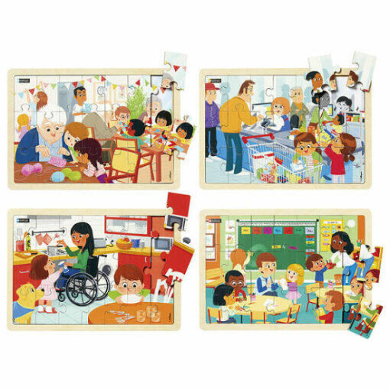 Quatro puzzles de madeira: Na casa de repouso + No supermercado + Na escola + Em casa