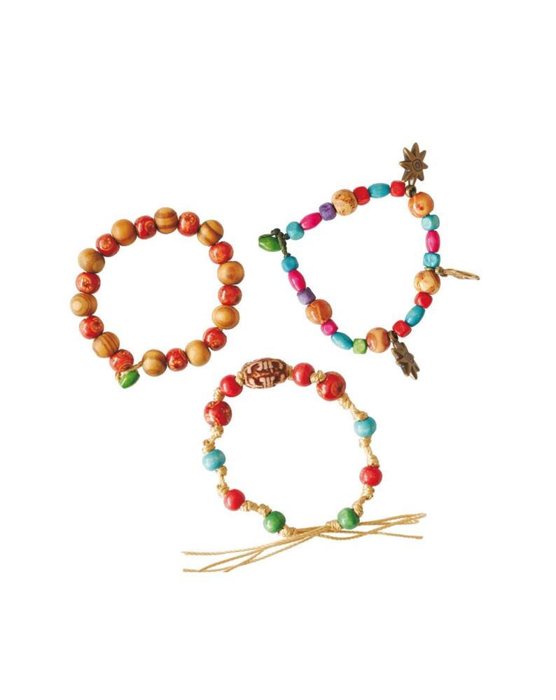 Faça 7 pulseiras diferentes com este lindo kit. Conteúdo: contas de madeira, peças decorativas e fios coloridos.