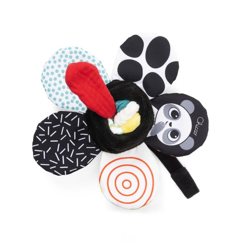 5 pétalas com ilustração a preto e branco de alto contraste e 5 coloridas feitas de diferentes tecidos para puxar do centro - perfeito para a exploração sensorial.
