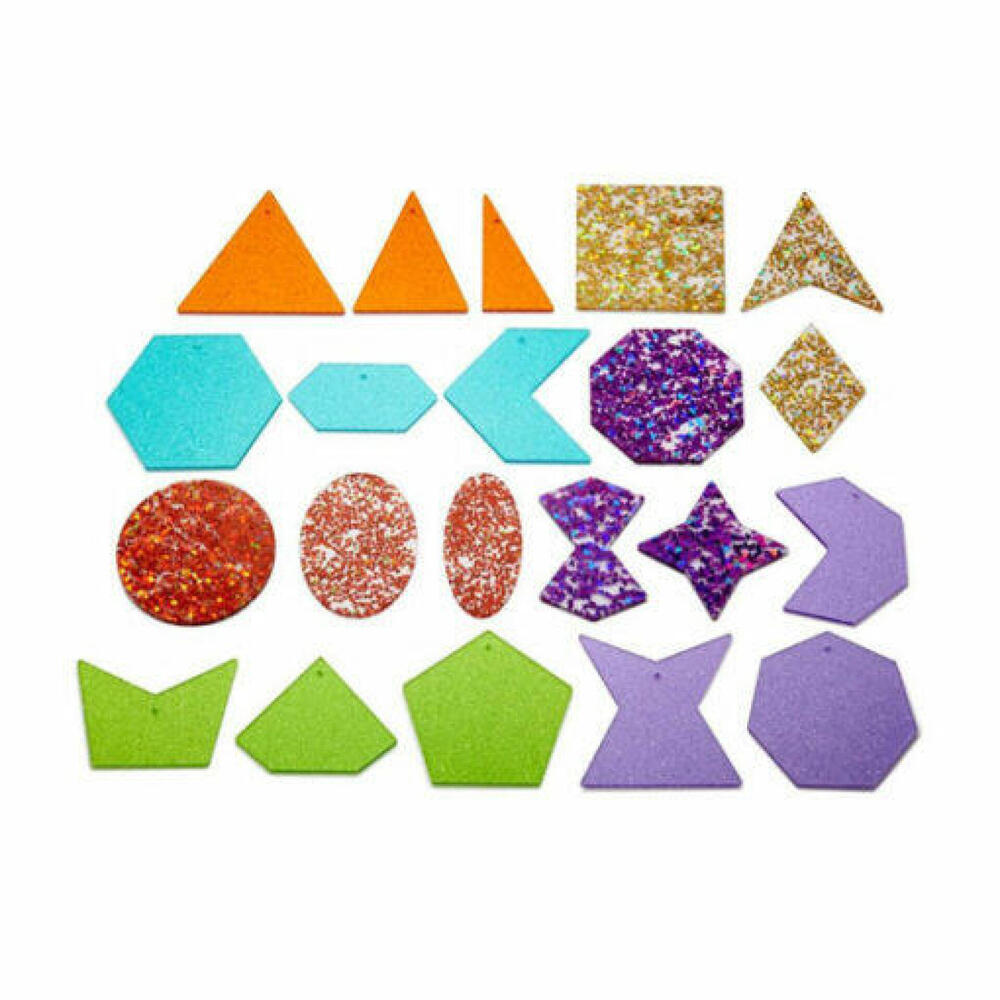 Cada cor inclui 3 versões de polígono: irregular e regular, ideais para compreender princípios geométricos simples. As formas são feitas de acrílico de 3 mm e podem ser usadas em um painel de luz e cada uma vem com um orifício de 2,5 mm no ponto de equilíbrio superior para que possam ser penduradas em uma janela ou ao ar livre para criar sombras de formas coloridas fascinantes.