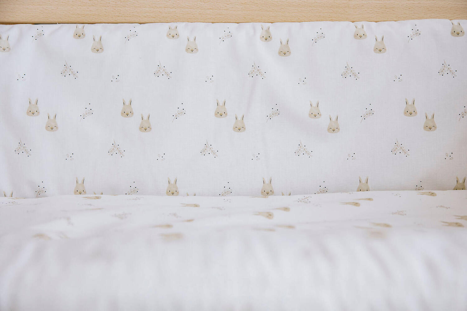Doce e simpático! O novo tecido Rabbits combinado com musselina é perfeito para o nosso mini berço Mini Converbaby 90x50.