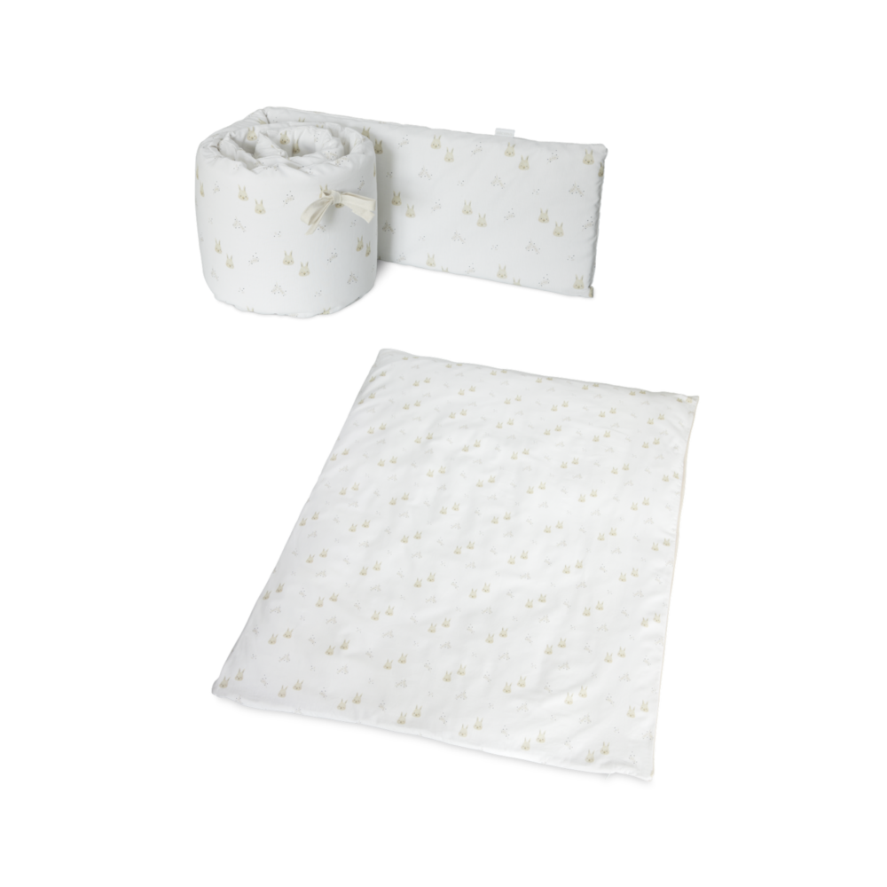 Conjunto composto por edredão e protetor de grades de duas peças, que rodeia todo o interior do berço para evitar impactos. Todos os elementos incluem enchimento e são removíveis. O novo padrão Rabbits combinado com mousselina é perfeito para mini-berços 80x50.