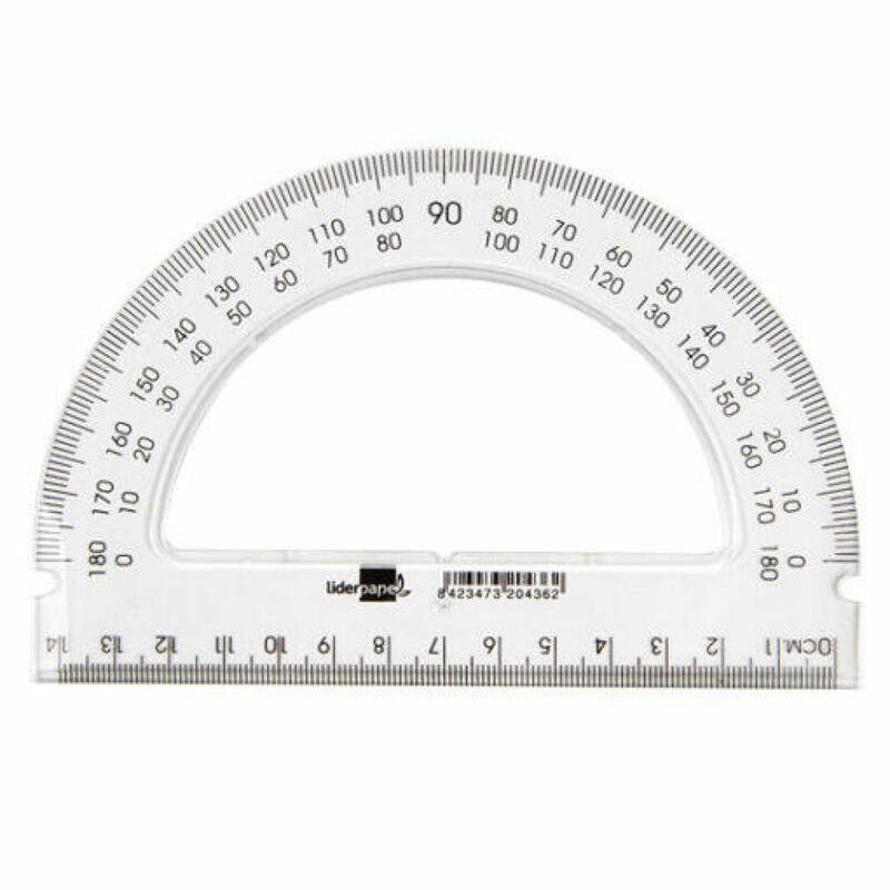 Semicírculo de plástico de 14 cm. Transferidor de ângulo em plástico transparente. Contém 2 escalas opostas de 0° a 180°. Base de 140 mm. (ler mais)