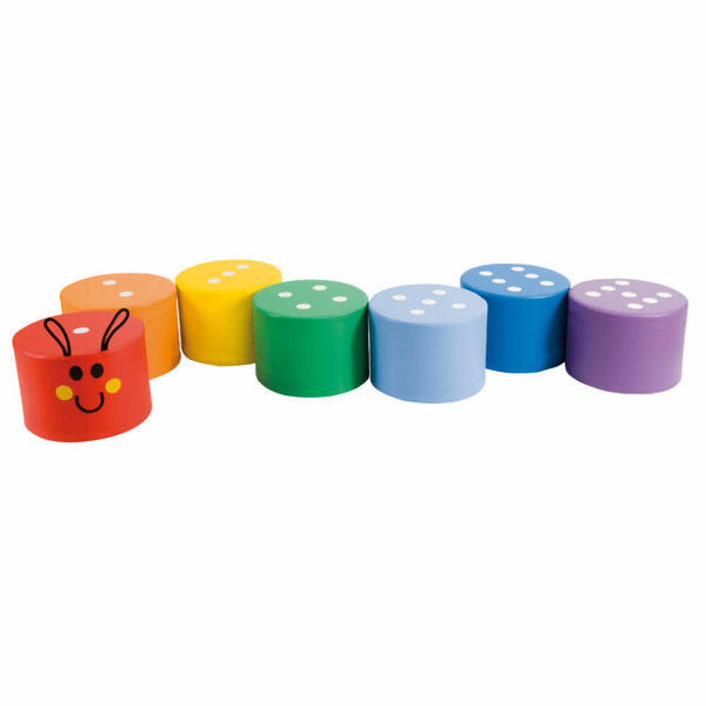 Conjunto de 7 blocos de espuma de cores diferentes e com pontos desenhados na parte superior numerando cada bloco (tipo dominó). O primeiro bloco tem o desenho de uma cabeça de lagarta... (ler mais)