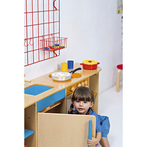 Módulo composto por uma banca, um frigorífico, duas estantes e uma mesa de cozinha com cantos redondos. Pode colocar-se encostado à parede ou a uma cozinha multifunções. Inclui um soquete.