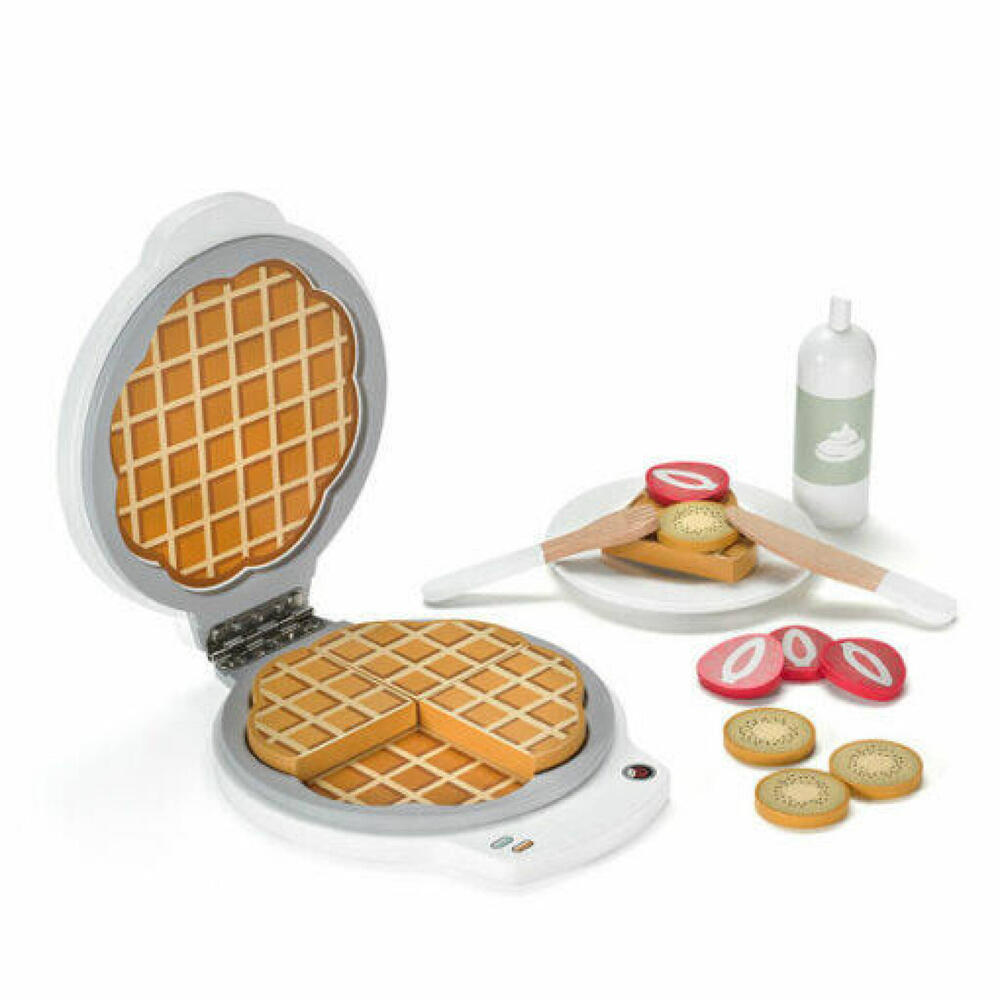 Máquina de waffles com acessórios. O conjunto inclui uma máquina de waffles, 4 waffles, 8 pedaços de madeira de kiwi e rodelas de morango para colocar nos waffles. Um pote de chantilly, um prato, uma faca e um garfo. Tudo pronto para uma festa de waffles perfeita.