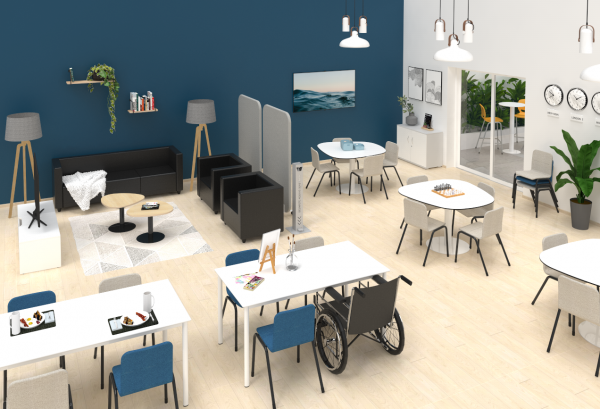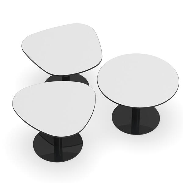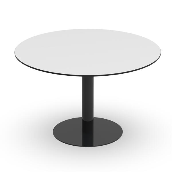 Estrutura com pé central em tubo de aço Ø70mm com acabamento em pintura epoxy. Base circular em aço de espessura 8mm. Tampo em contraplacado de bétula de 18mm com verniz poliuretano.