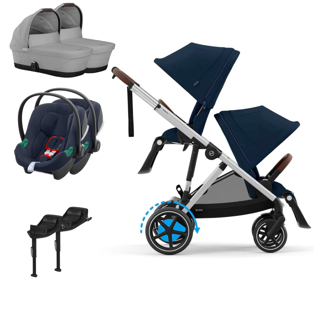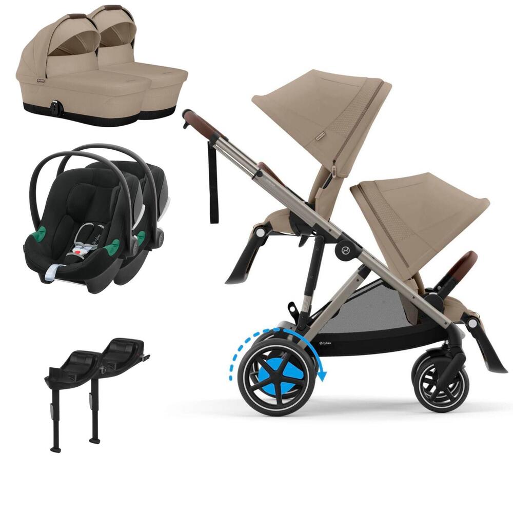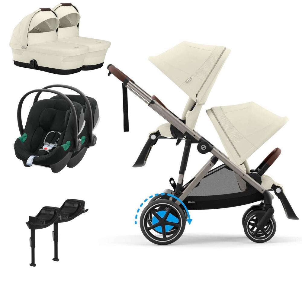 Conjunto composto por carrinho e-Gazelle S, segundo assento Gazelle S e duas cadeiras auto Aton B2, mais duas bases One e duas Alcofas Gazelle S Cot. Permite uma solução à medida desde o nascimento até aproximadamente aos 4 anos.