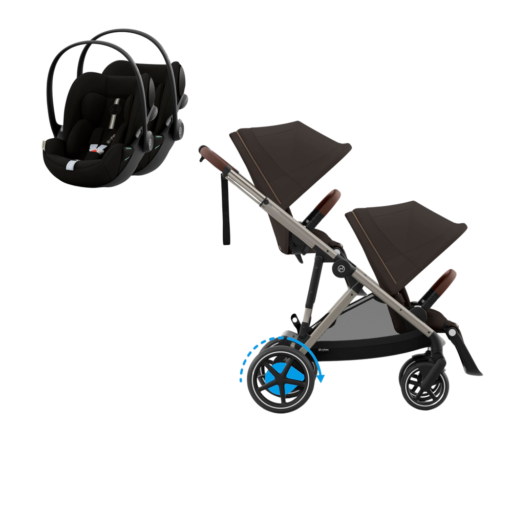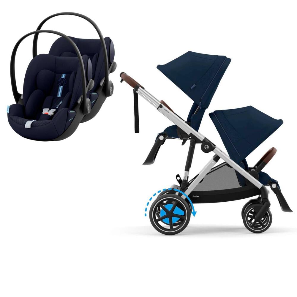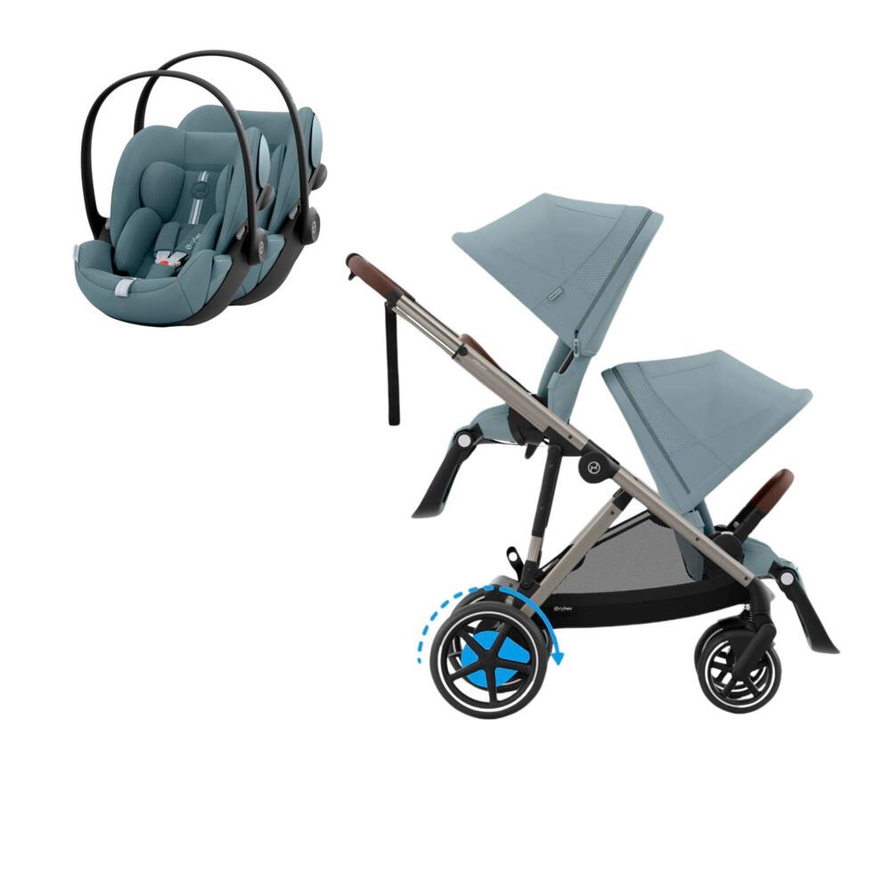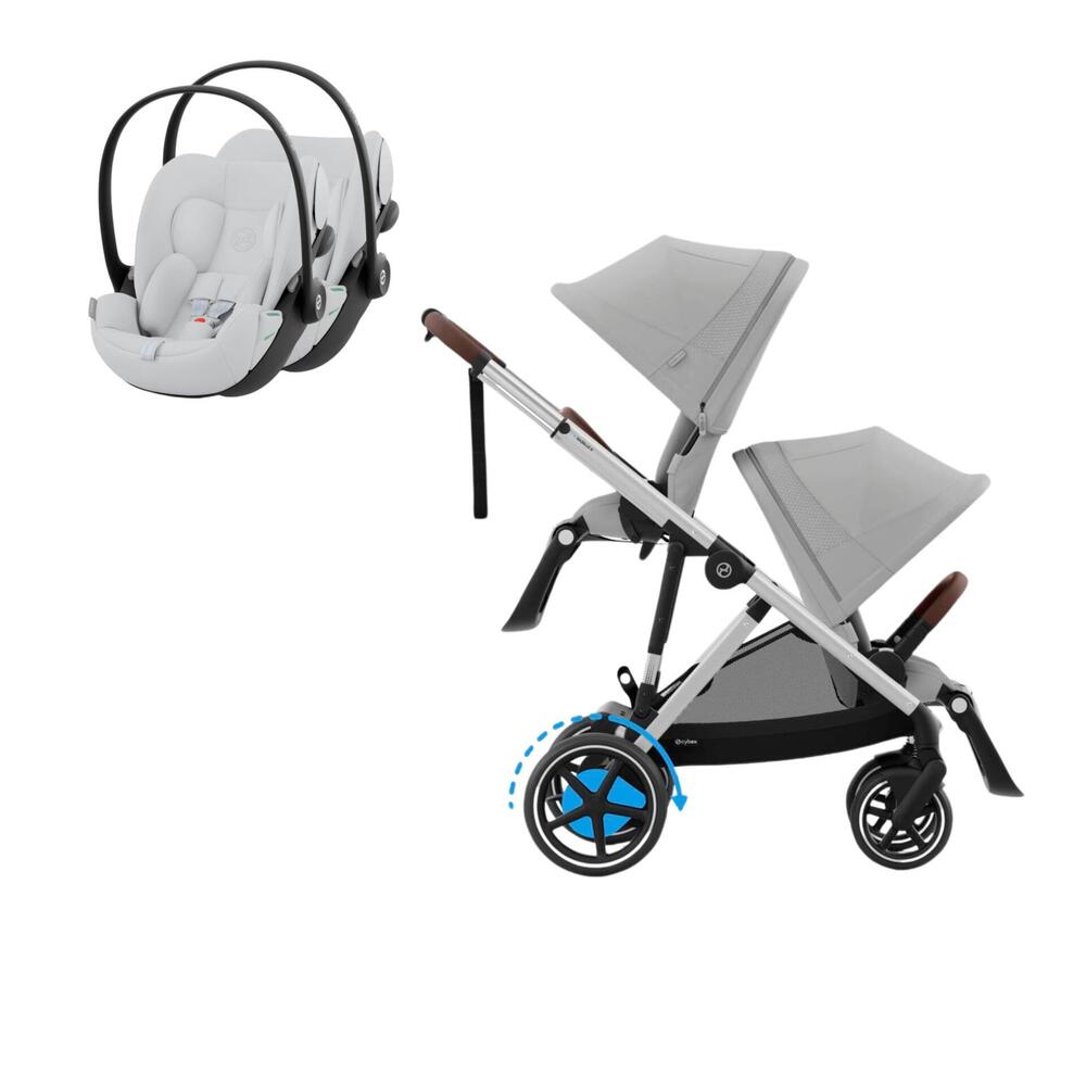Conjunto composto por carrinho e-Gazelle S, segundo assento Gazelle S e duas cadeiras auto Cloud G i-Size. Permite uma solução à medida desde o nascimento até aproximadamente aos 4 anos.