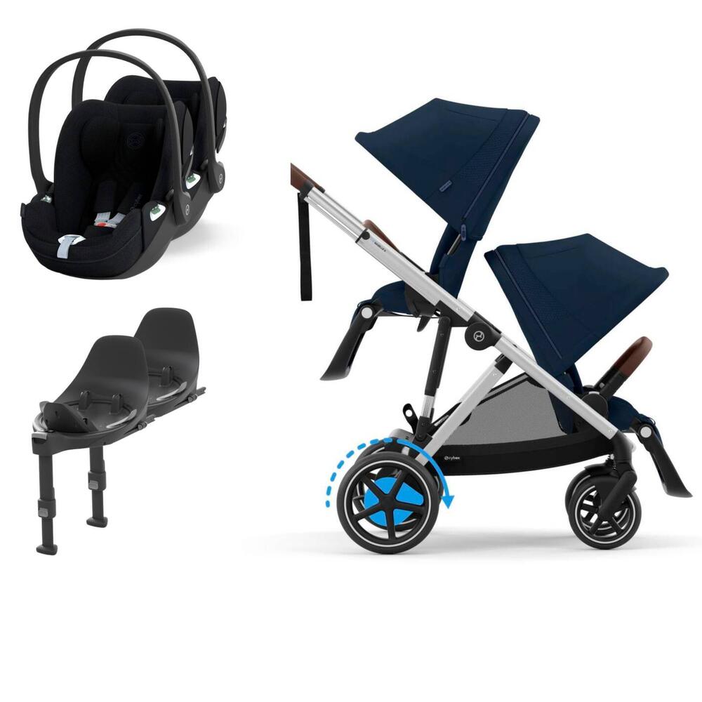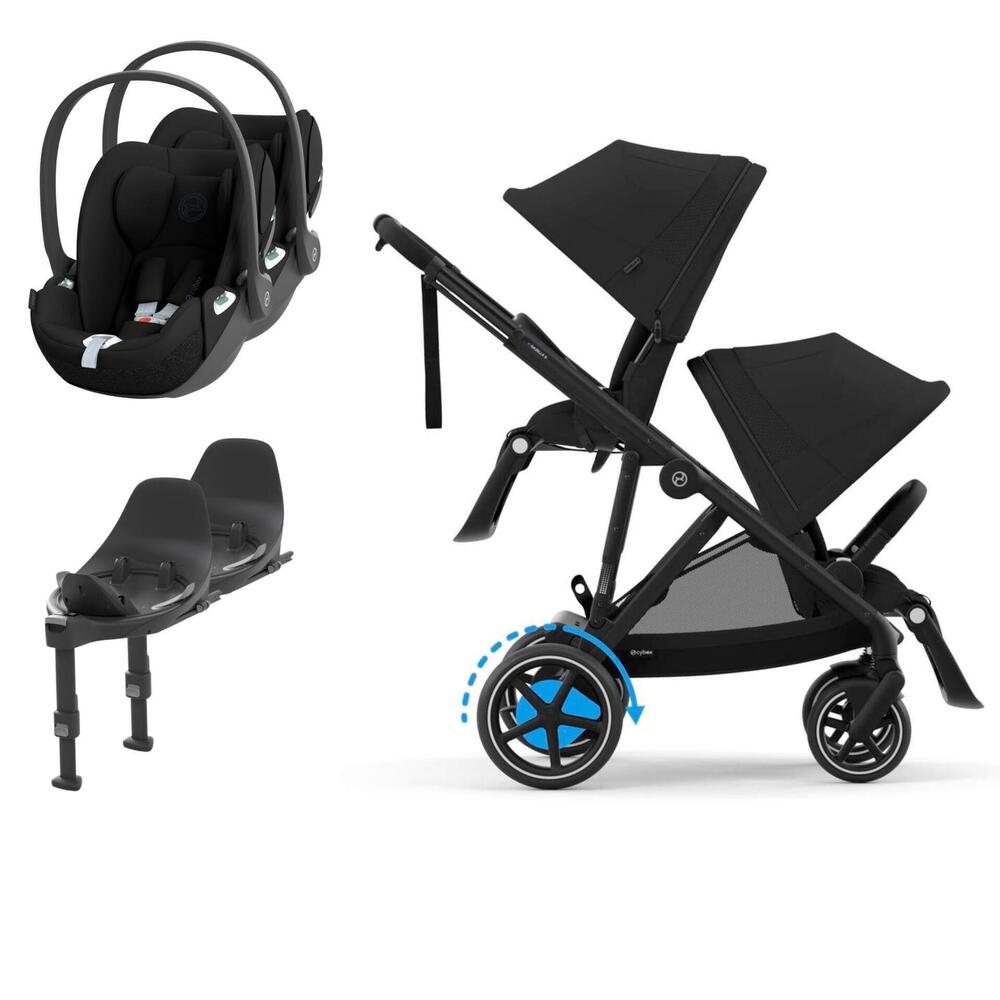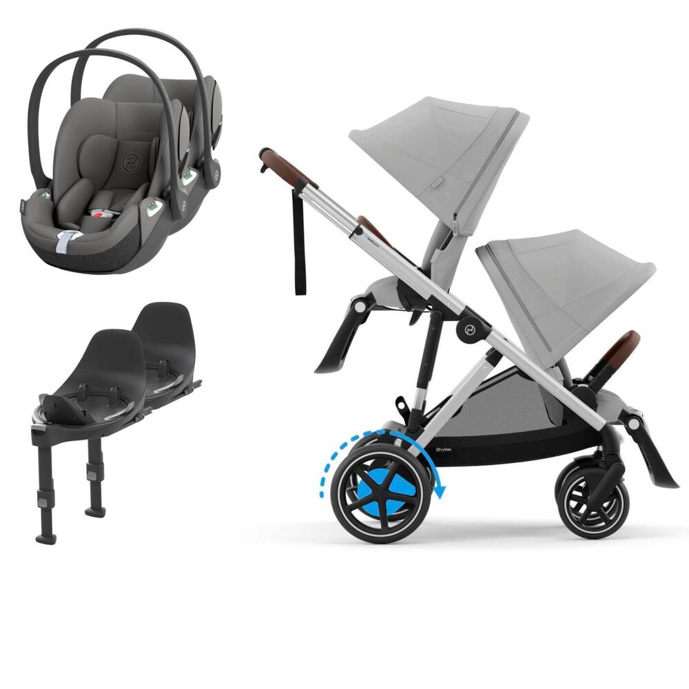Conjunto composto por carrinho e-Gazelle S, segundo assento Gazelle S e duas cadeiras auto Cloud T i-Size e duas bases T rotativas. Permite uma solução à medida desde o nascimento até aproximadamente aos 4 anos.