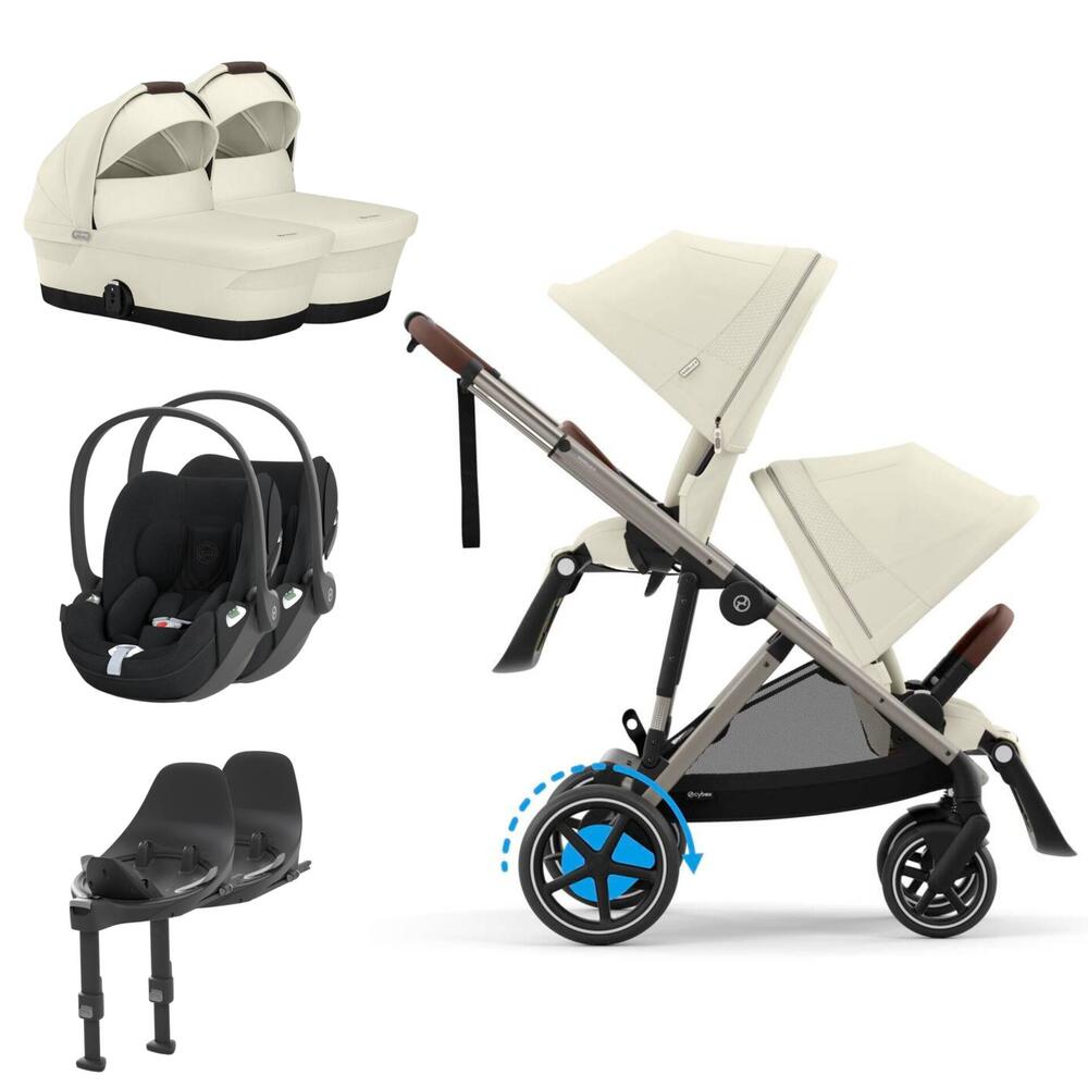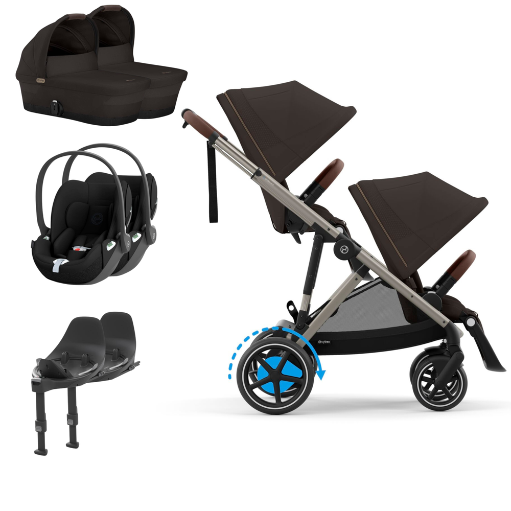 Conjunto composto por carrinho Gazelle S, segundo assento Gazelle S e duas cadeiras auto Cloud T i-Size, mais duas bases T e duas Alcofas Gazelle S Cot. Permite uma solução à medida desde o nascimento até aproximadamente aos 4 anos.