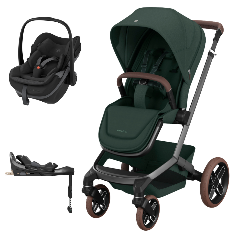 Conjunto composto pelo carrinho Fame, Pebble Slide Pro e FamilyFix Slide Pro.