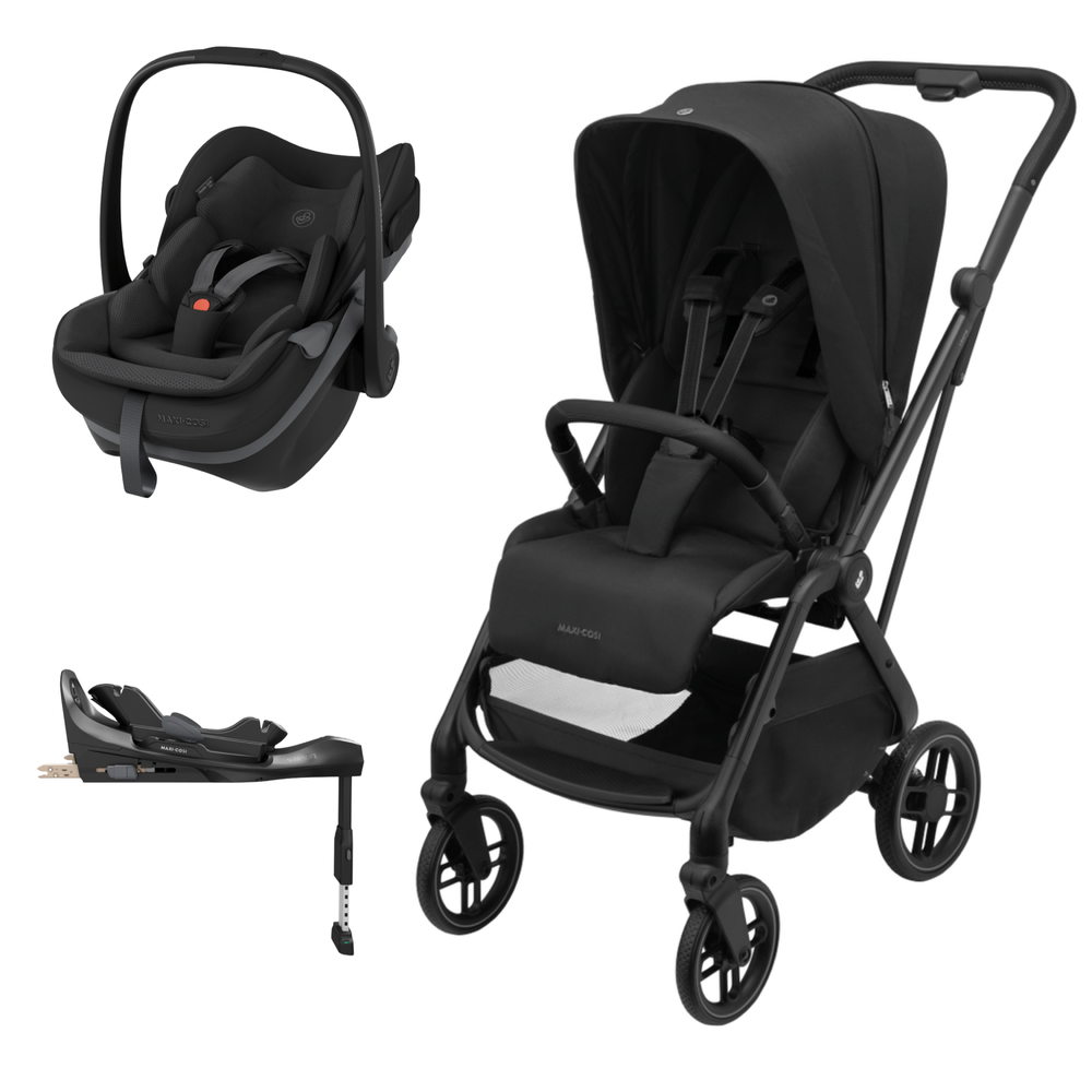 Conjunto composto pelo carrinho Leona 2, Pebble Slide Pro e FamilyFix Slide Pro.