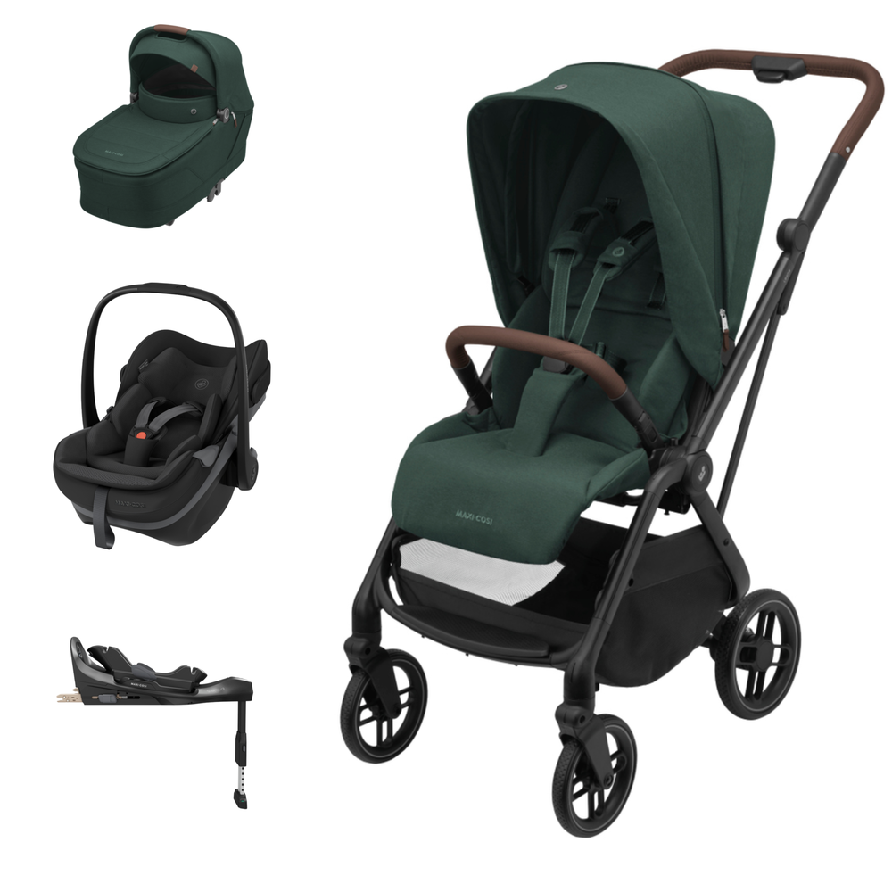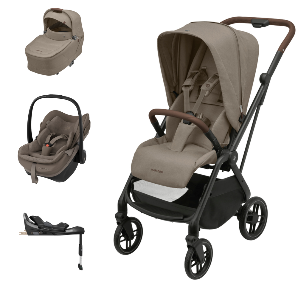 Conjunto composto pelo carrinho Leona 2, Pebble Slide Pro, FamilyFix Slide Pro e Alcofa Sense.
