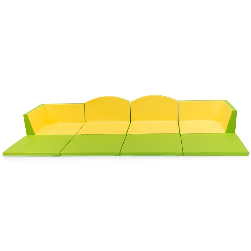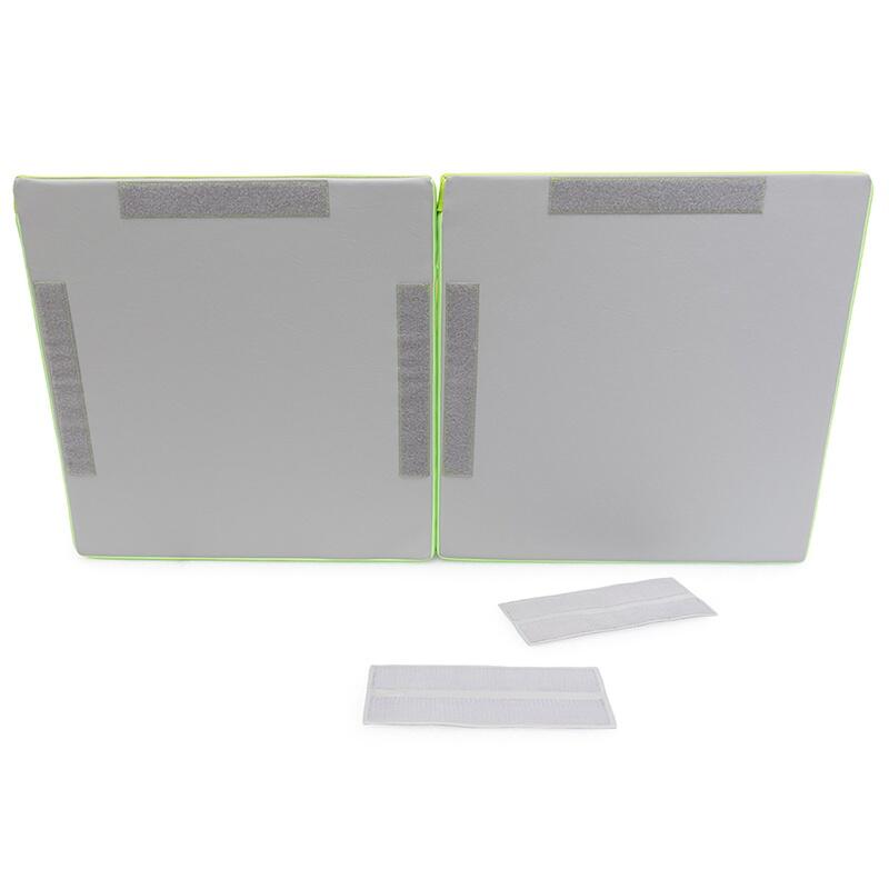 Peças fabricadas em espuma de poliuretano de 23kg/m3, revestidas com tela PVC impermeável, lavável, com tratamento ignifugo M2, isenta de ftalatos, ou de produtos nocivos para a saúde das crianças, respeitando as normas europeias de segurança.