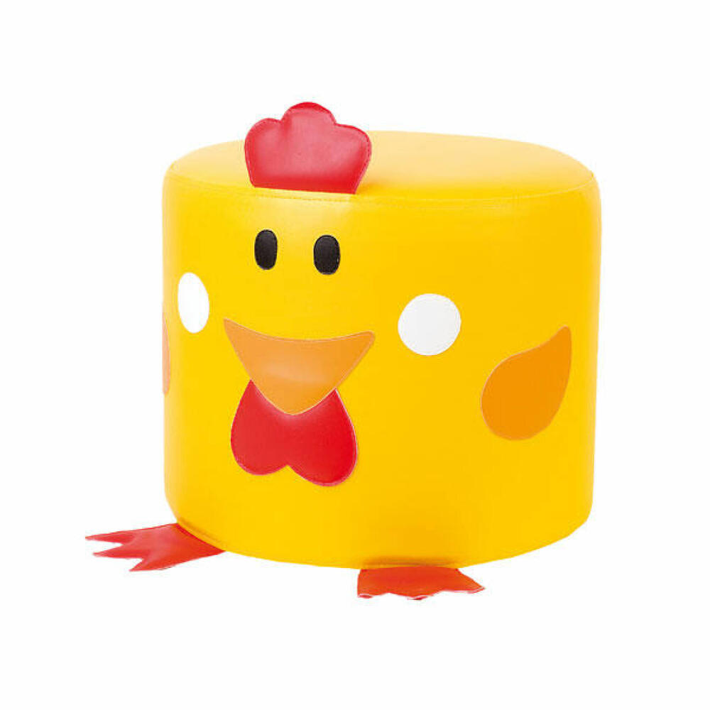 Um pequeno pufe com a imagem de uma galinha. Fabricado em espuma macia e revestido com PVC. Diâmetro 35 cm. x 30 cm de altura. (ler mais)