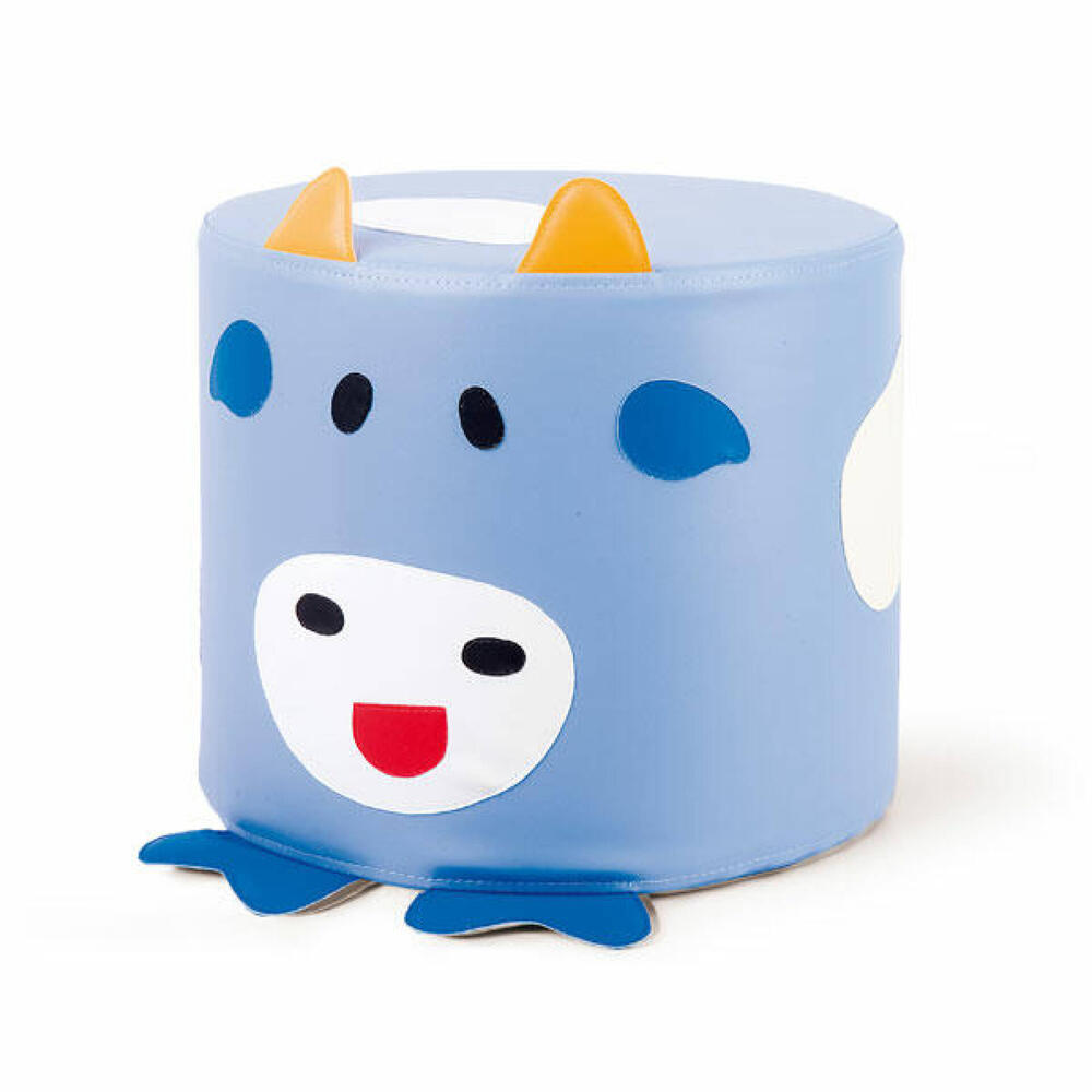 Um pequeno pufe com a imagem de uma vaca. Fabricado em espuma macia e revestido com PVC. Diâmetro 35 cm. x 30 cm de altura. (ler mais)