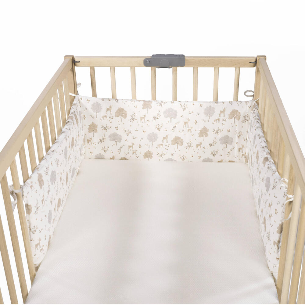 Design "Nara" inspirado na natureza: o protetor apresenta um bonito e subtil estampado de veados e árvores em tons neutros suaves (bege, cinzento claro, branco), evocando a serenidade da floresta. Um design intemporal e elegante que complementa a decoração de qualquer quarto de bebé.