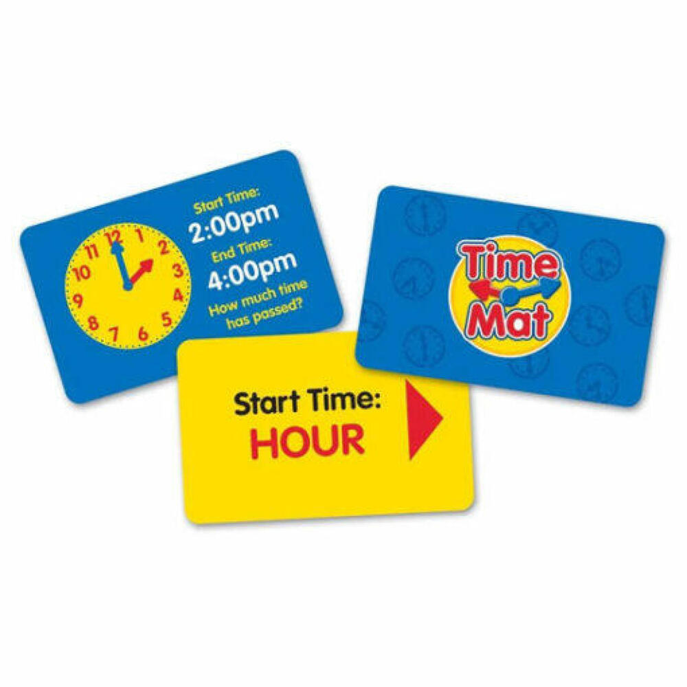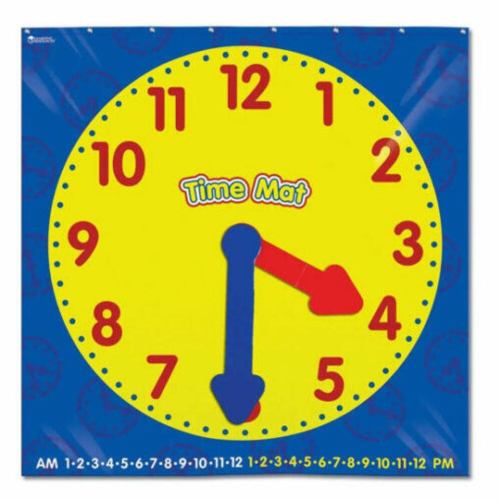 Este tapete de atividades reforça o cálculo do tempo em incrementos de 5 minutos. Há também uma linha numérica na parte inferior do tapete para atividades de tempo decorrido.