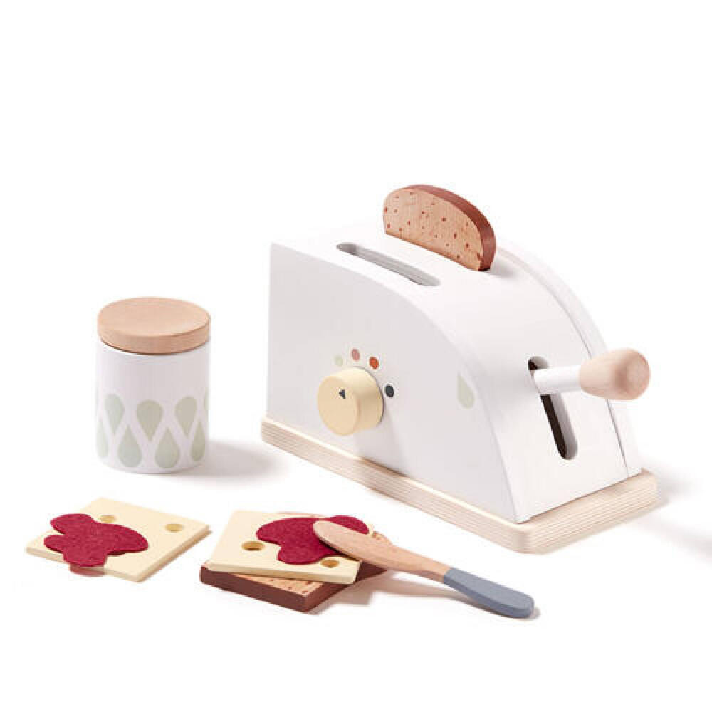 Conjunto de torradeira de madeira com 8 acessórios. Use a alavanca para retirar as fatias torradas e gire o botão para ajustar o calor. Inclui um pote de geléia, 2 fatias de pão, 2 fatias de queijo, 2 pedaços de geléia e uma faca para regar.